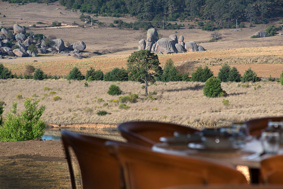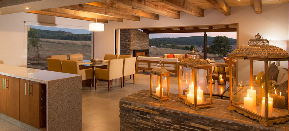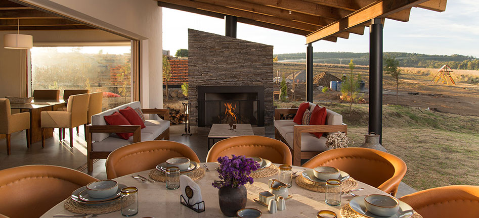 Mesa equipal para 8 con cubierta de granito, sala y chimenea de leña invitan a la convivencia.