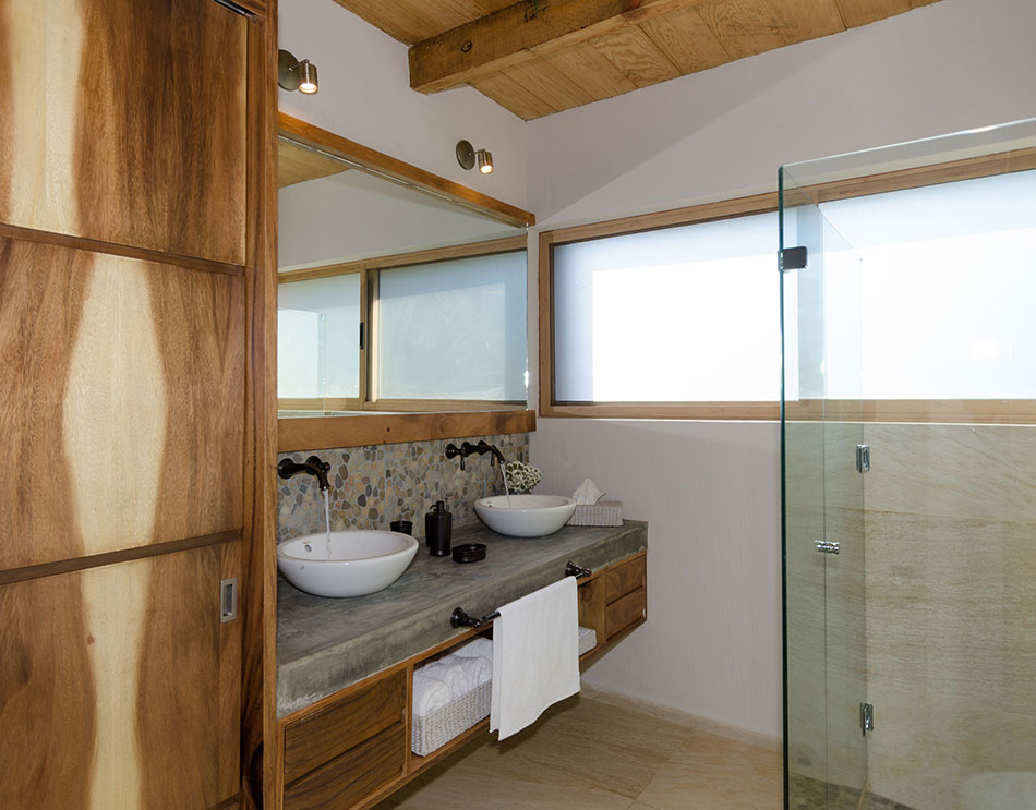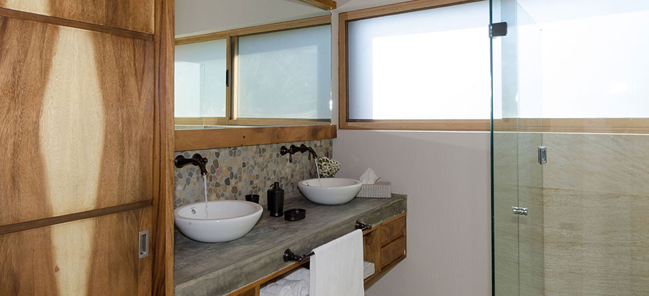 Acabados de primera calidad, doble lavabo y cancelería de cristal templado.
